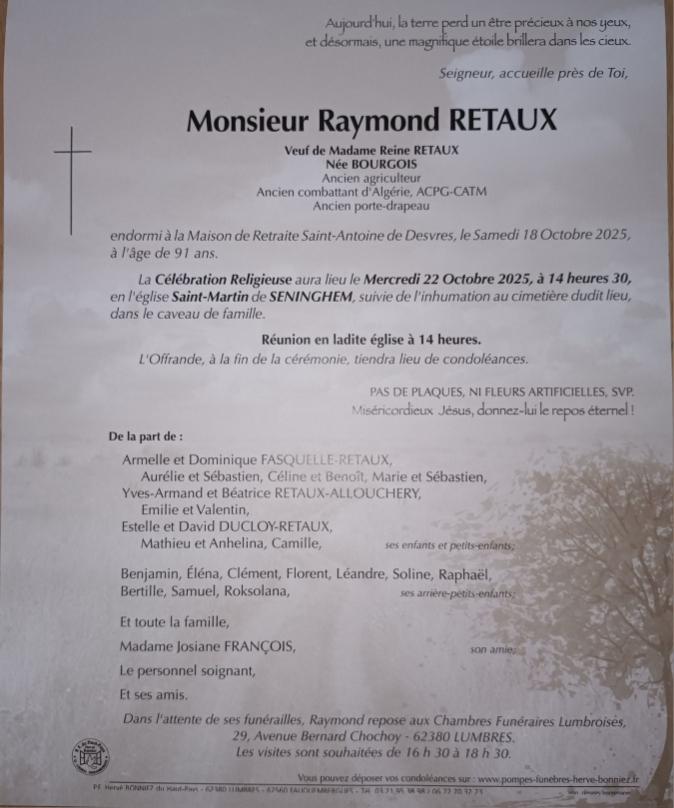 C’est avec une grande tristesse que nous vous annonçons le décès de Raymond RETAUX survenu le samedi 18 octobre 2025 à Desvres. La cérémonie se déroulera le mercredi 22 octobre 2025 à 14h30 à l’adresse suivante : Église Saint Martin - 62380 Seninghem.